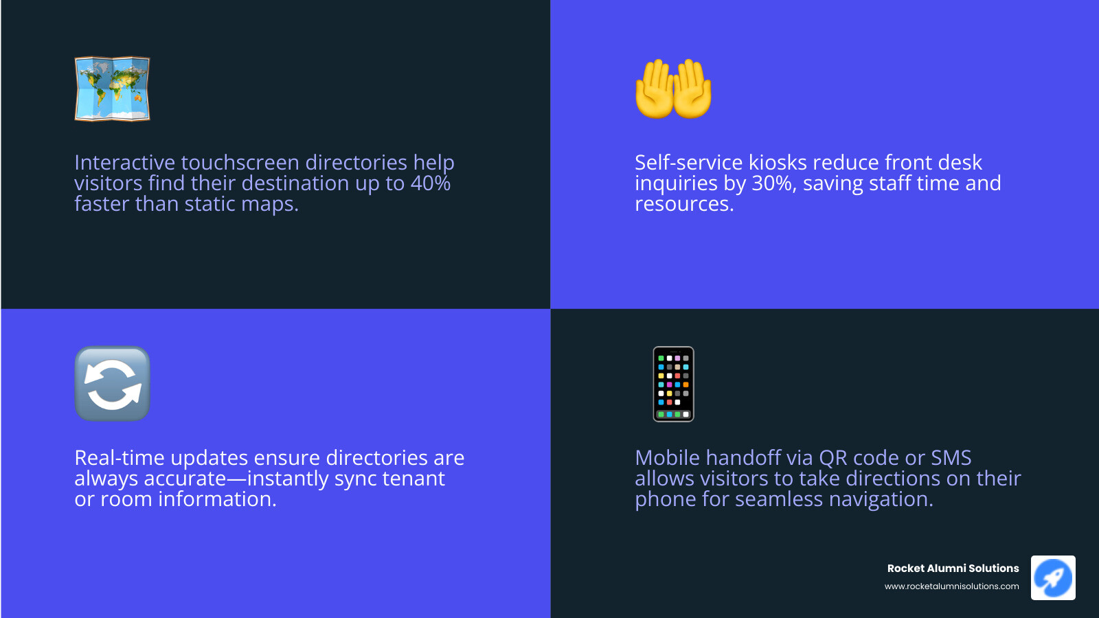 With a Touchscreen Kiosk Building Directory from Rocket Alumni Solutions, you’re not just keeping up—you’re getting ahead. Your lobby becomes a place where visitors feel confident, informed, and welcomed from the moment they walk in.